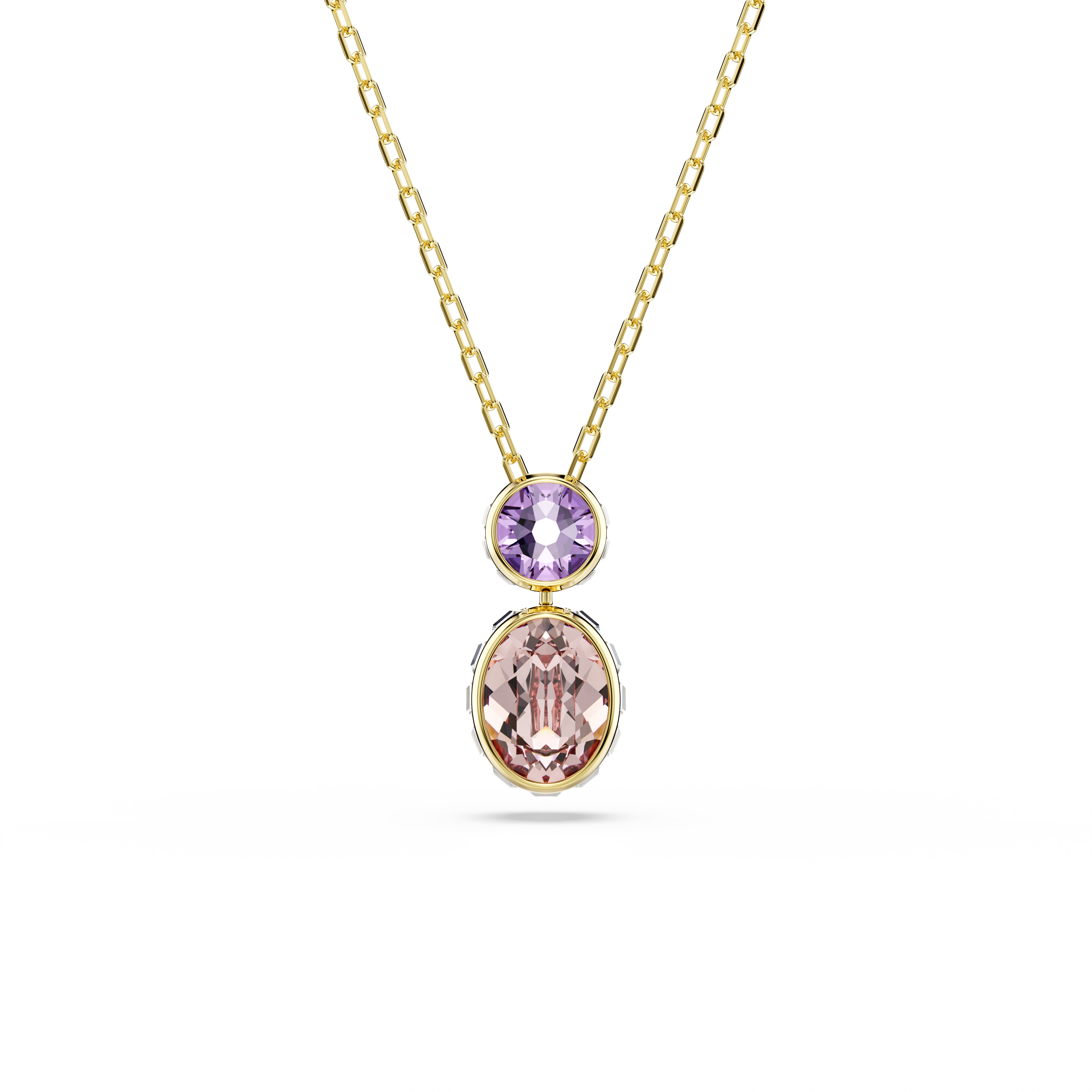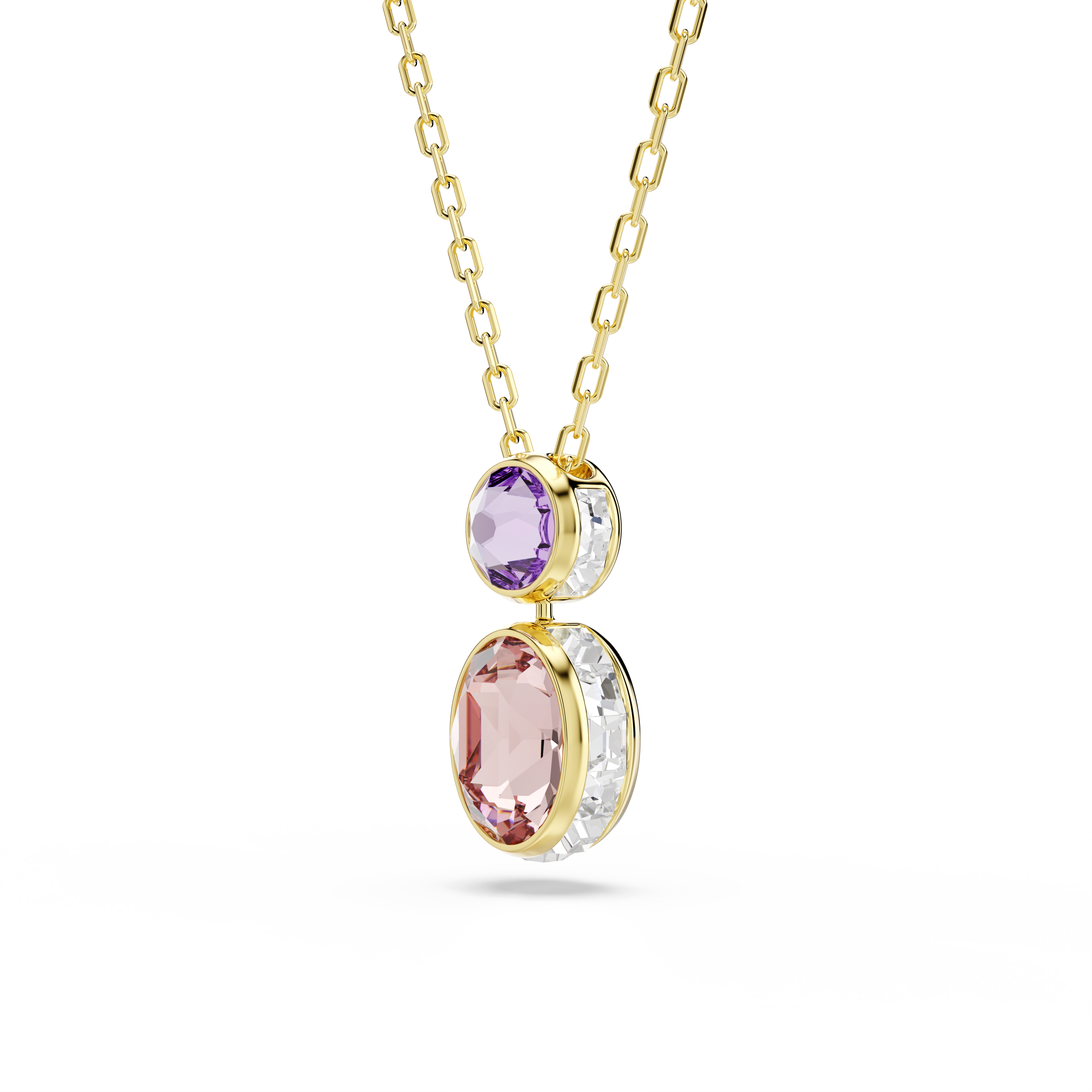 С этим кулоном Chroma вы можете поворачивать кристалл в соответствии со своим настроением. Дизайн золотистого цвета включает в себя центральный фиолетовый кристалл и более крупный двусторонний кристалл снизу, который с одной стороны прозрачный, а с другой — розовый. Поворачивайте его в любое время, чтобы выразить свою индивидуальность.