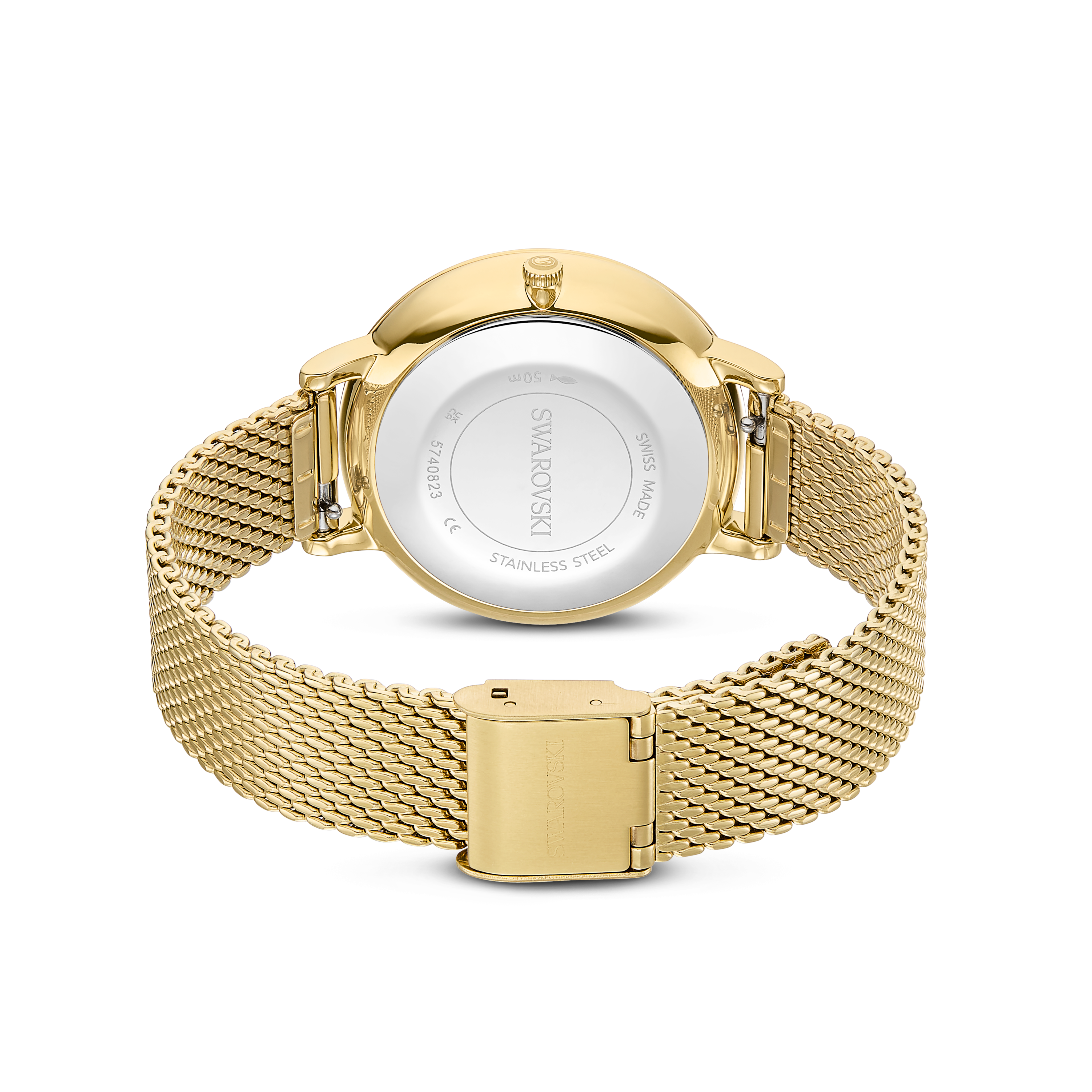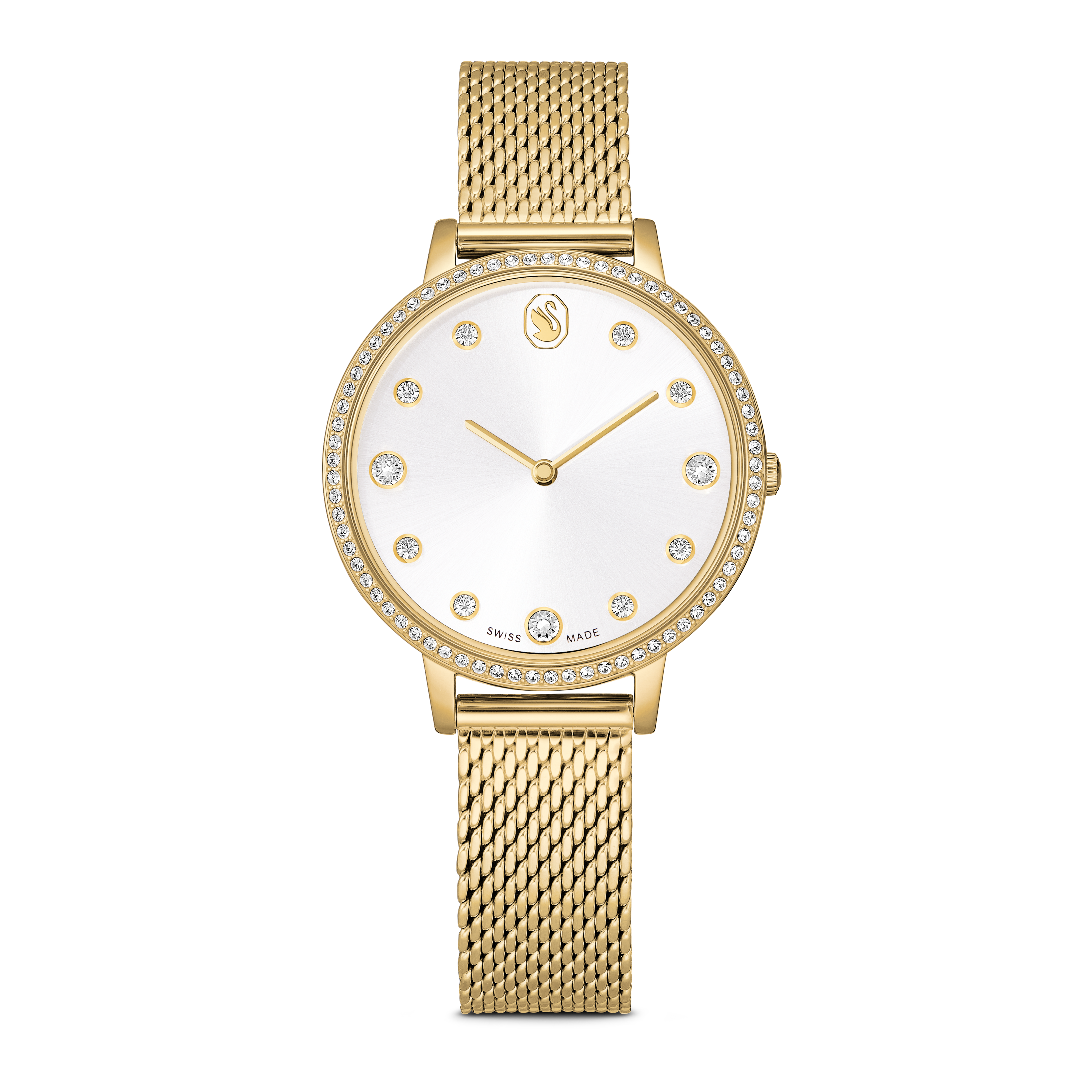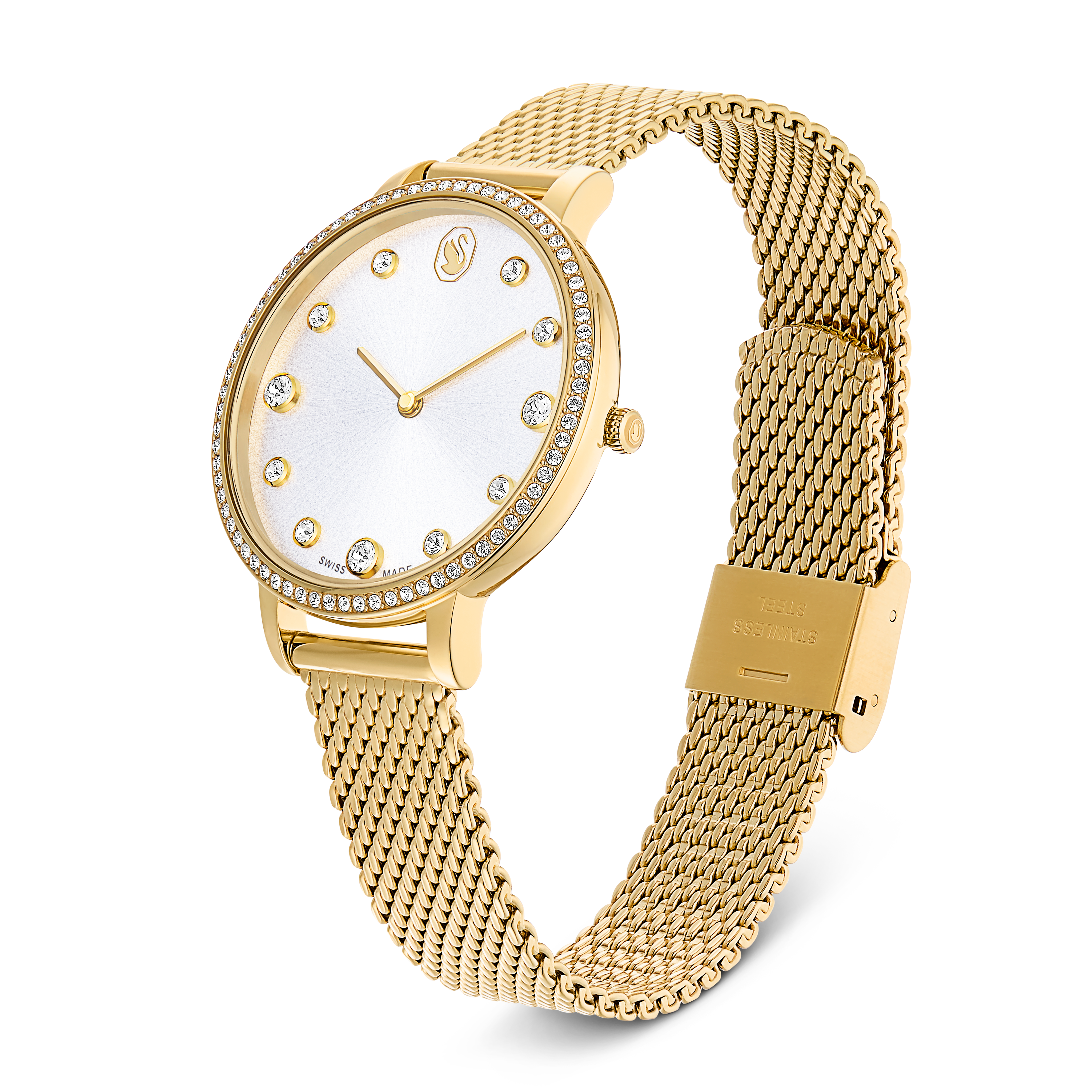 Эти элегантные часы Clarica отличаются фирменным миланским браслетом, который эффектно обхватывает запястье. 35-миллиметровая модель выполнена из нержавеющей стали с золотистым покрытием и имеет идеально круглый безель, инкрустированный 73 прозрачными кристаллами. На циферблате с эффектом солнечных лучей расположены 11 кристаллических индексов и эмблема лебедя на отметке 12 часов. Эти швейцарские часы водонепроницаемы до 50 метров и представляют собой классический выбор для повседневной роскоши.