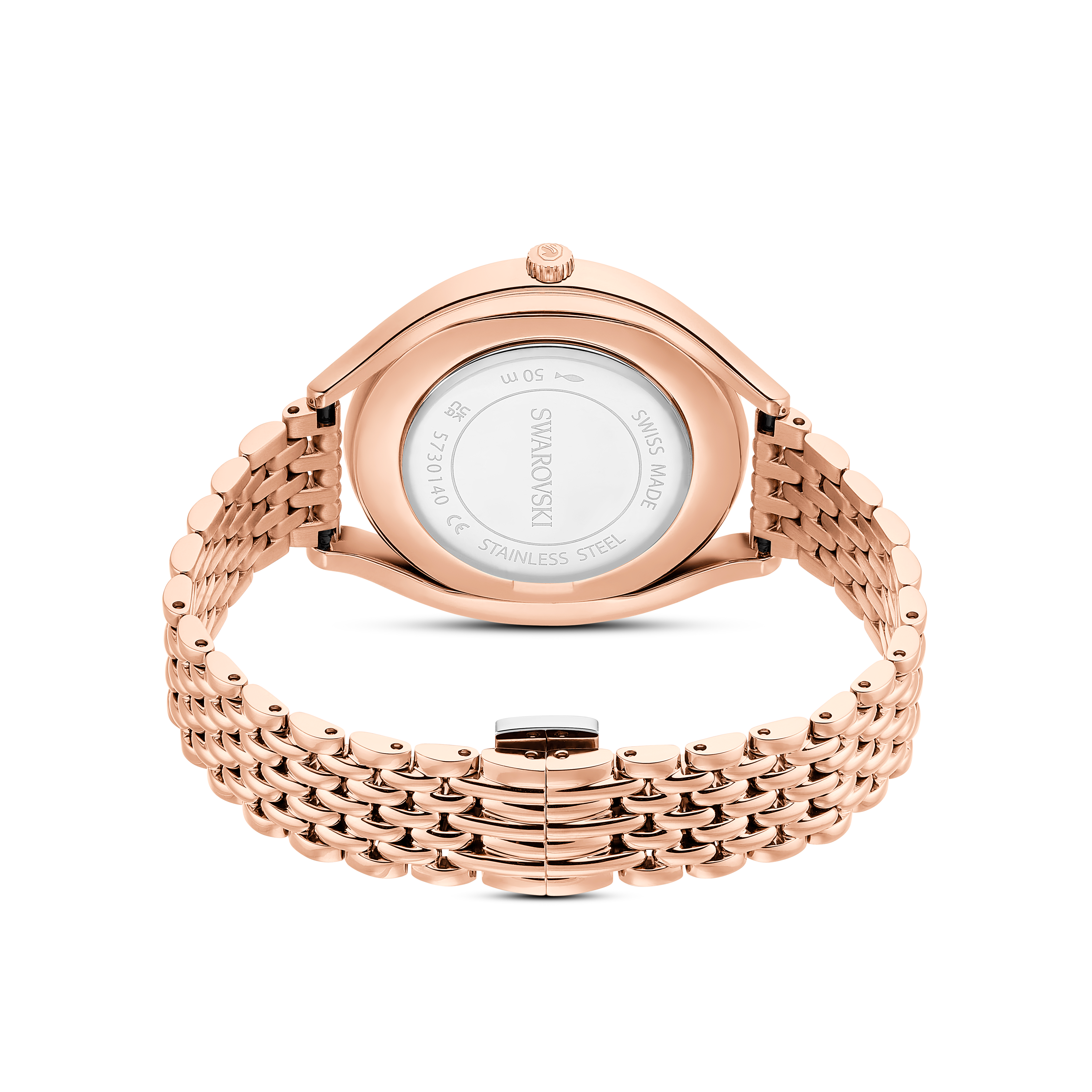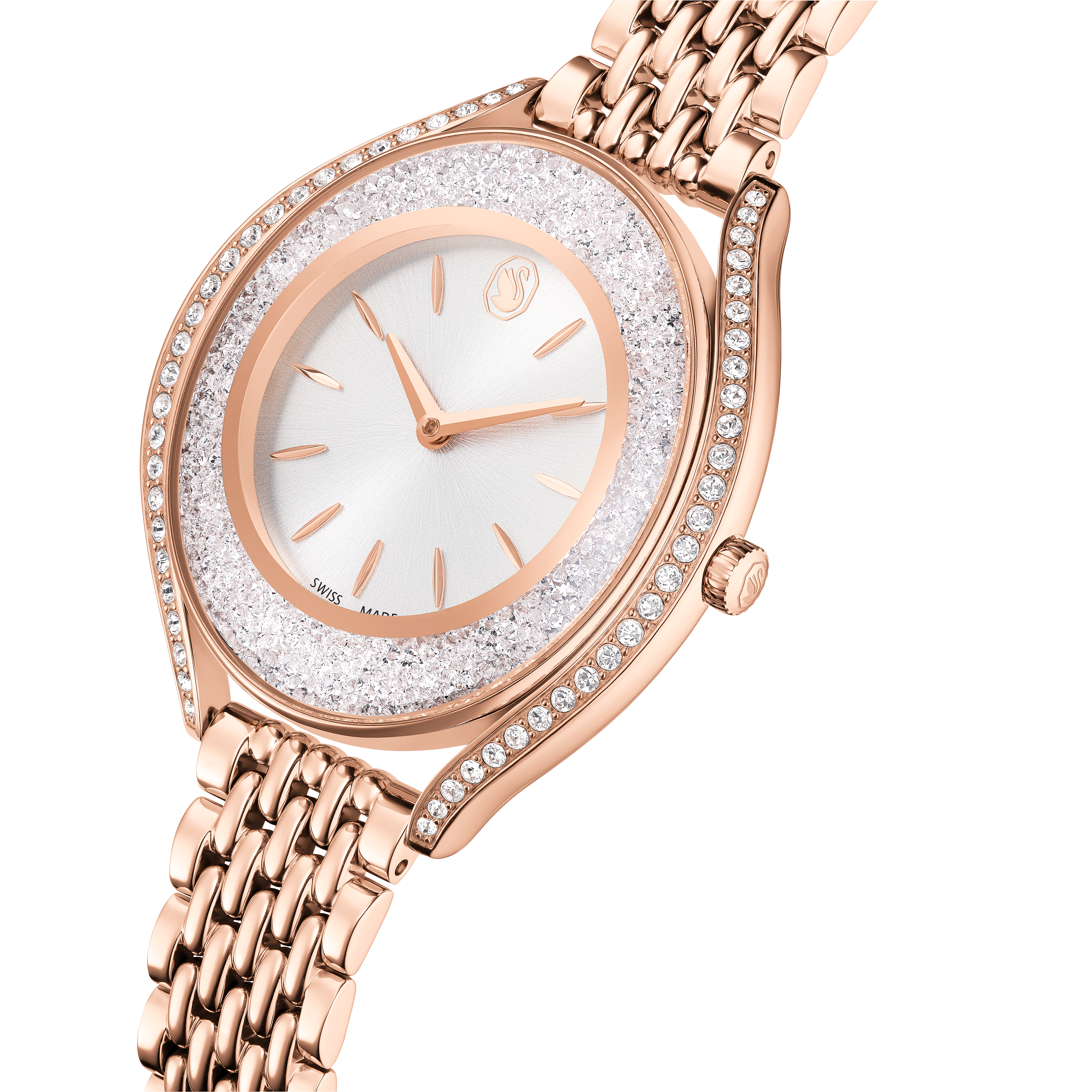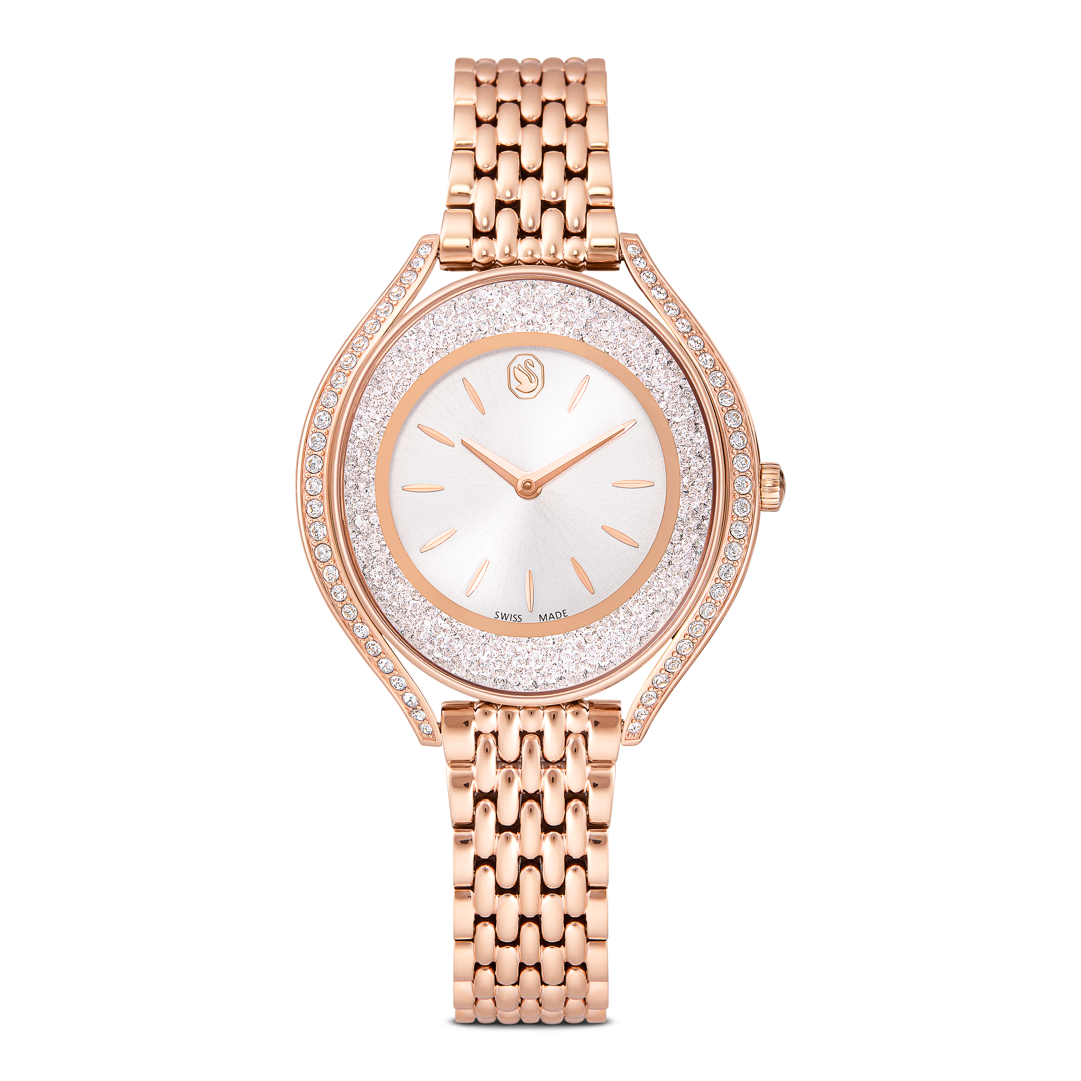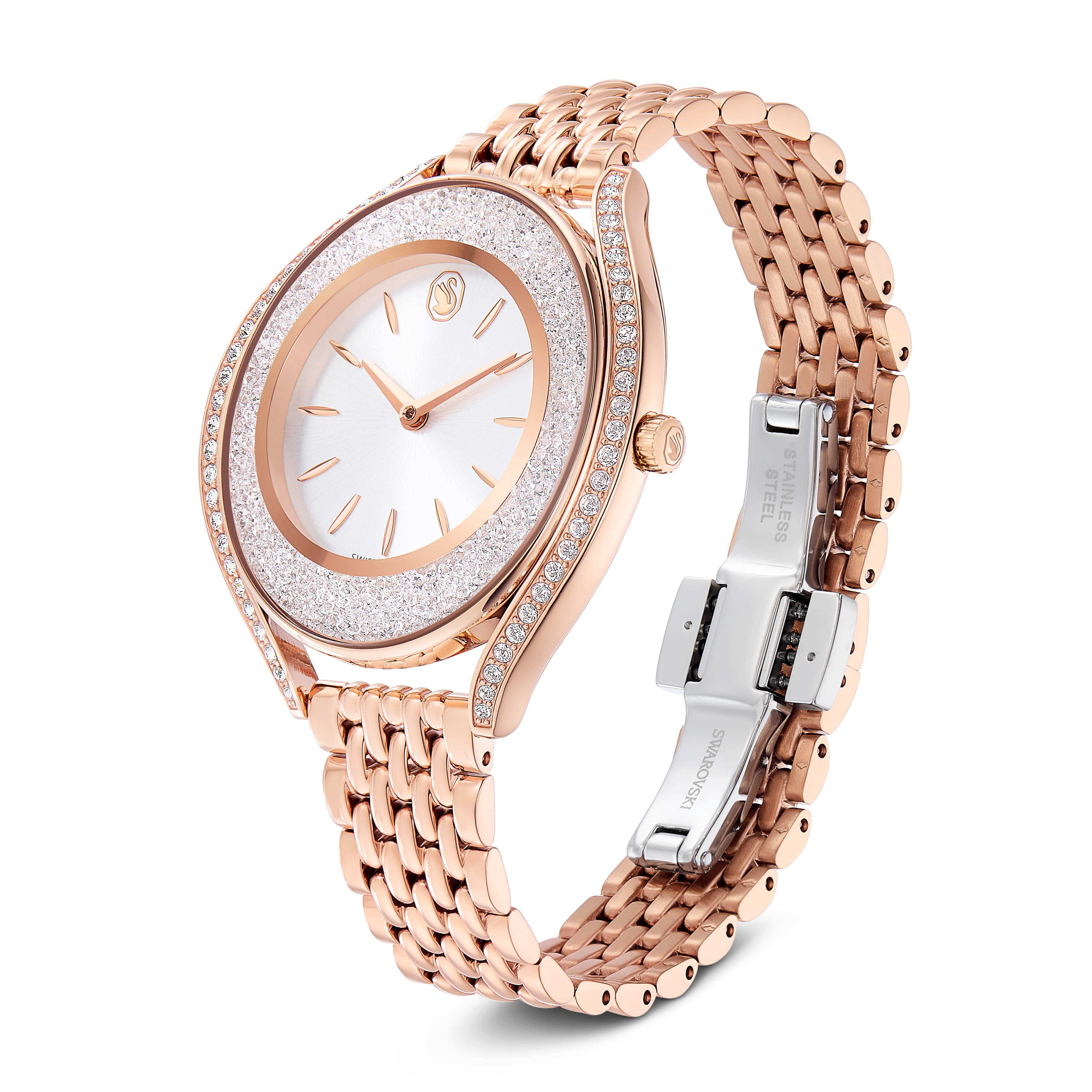 Корпус и браслет из нержавеющей стали с покрытием цвета розового золота. Фиксированный безель цвета розового золота с инкрустацией кристаллами. Серебристый циферблат со стрелками и индексными метками цвета розового золота. Лебедь Swarovski на отметке 12 часов. Кварцевый механизм. Устойчивое к царапинам минеральное стекло. Заводная головка с функцией вытягивания/нажатия. Сплошная задняя крышка. Овальная форма корпуса, размер корпуса: 40 x 35 мм. Раскладывающаяся застежка с предохранительным фиксатором. Водонепроницаемость до 50 метров / 165 футов. Функции: часы, минуты. Серия Crystalline. Стиль: классические часы. Маркировка часов: Swiss Made. Женские кварцевые часы Swarovski Crystalline
