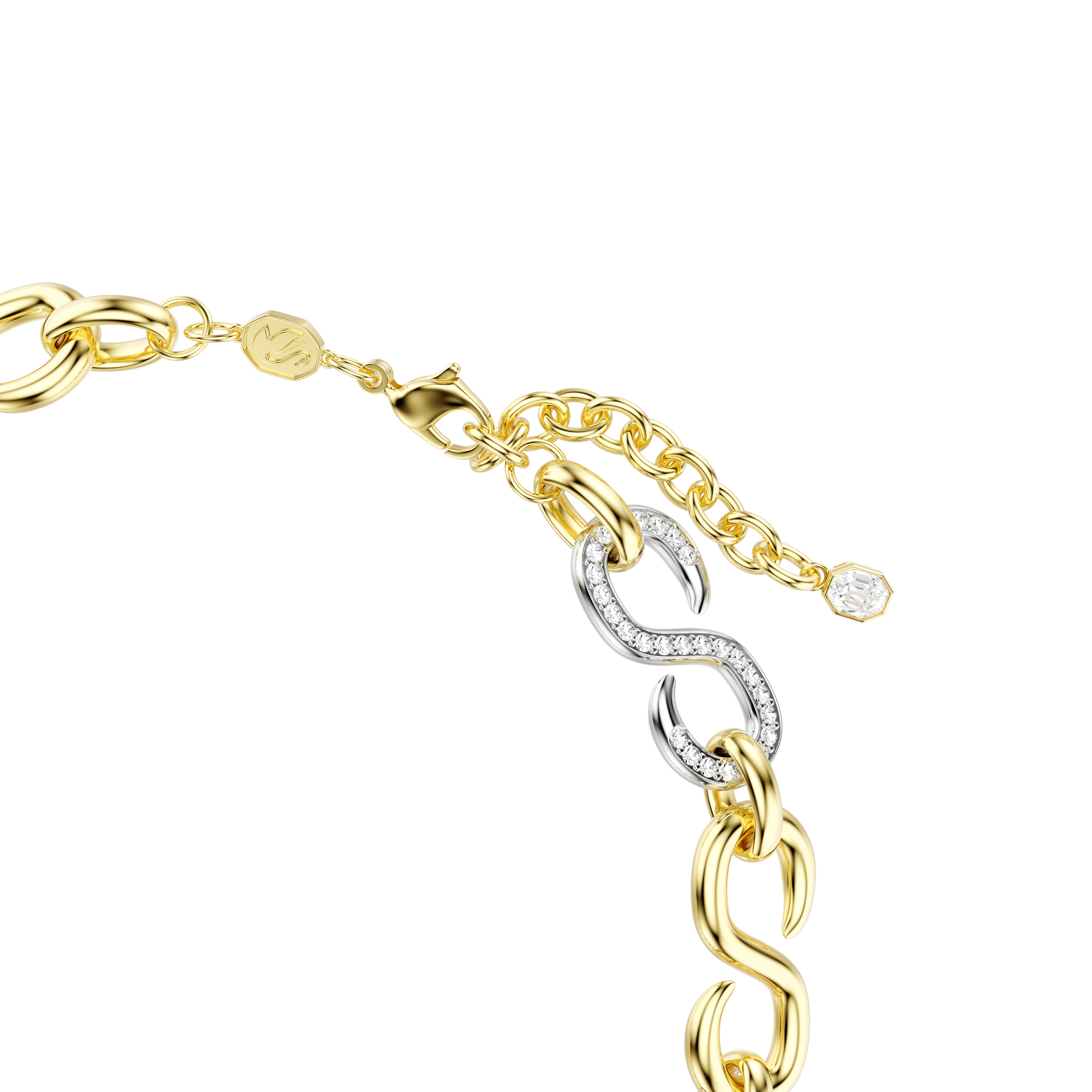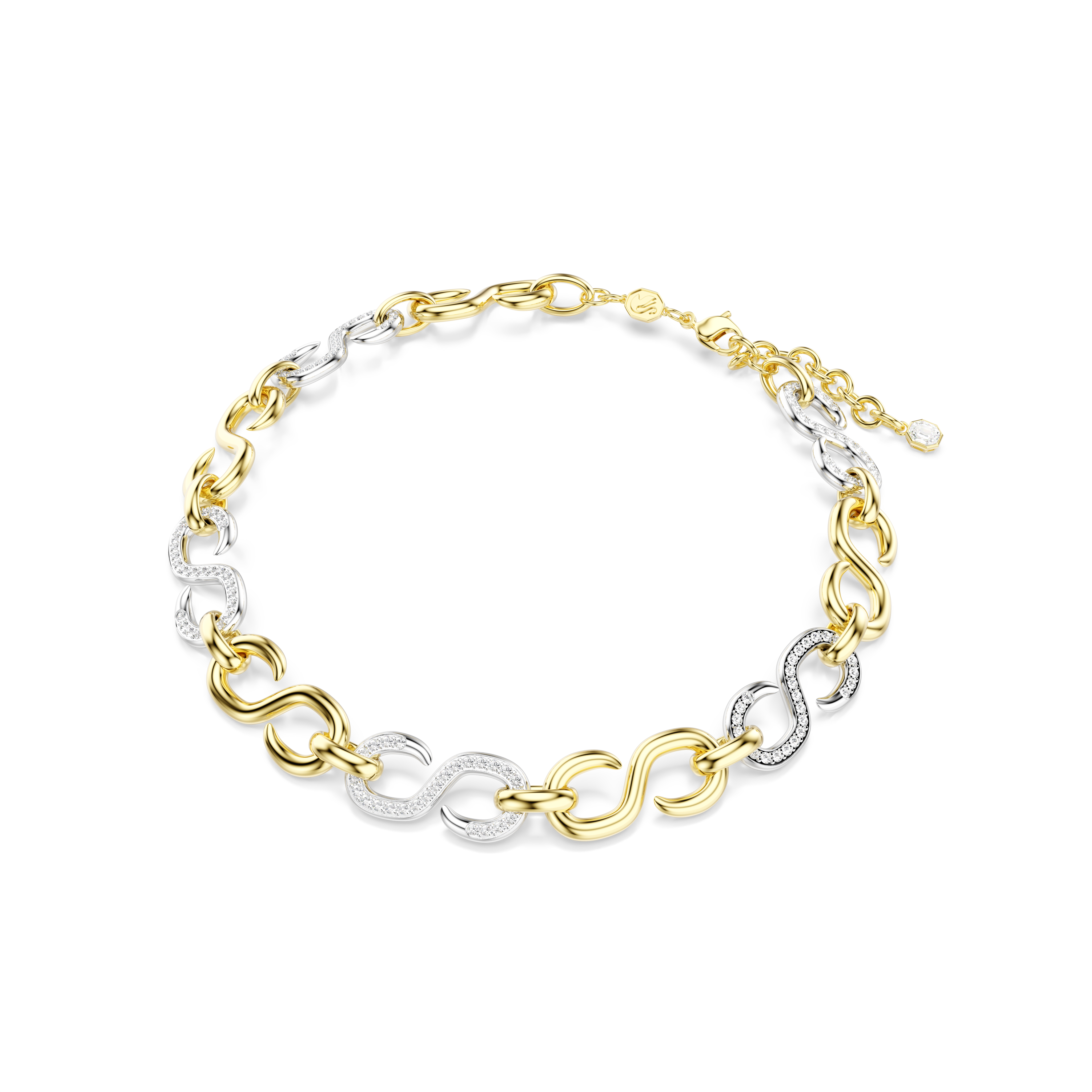 Это украшение от Dextera, которое можно носить как чокер или как колье, легко адаптируется к вашему стилю. Дизайн включает чередующиеся звенья с покрытием из золота и родия, а для максимального сияния добавлены прозрачные кристаллы. Благодаря изогнутым линиям и индустриальному дизайну, его можно сочетать с другими украшениями Dextera, выполненными в том же характерном стиле.