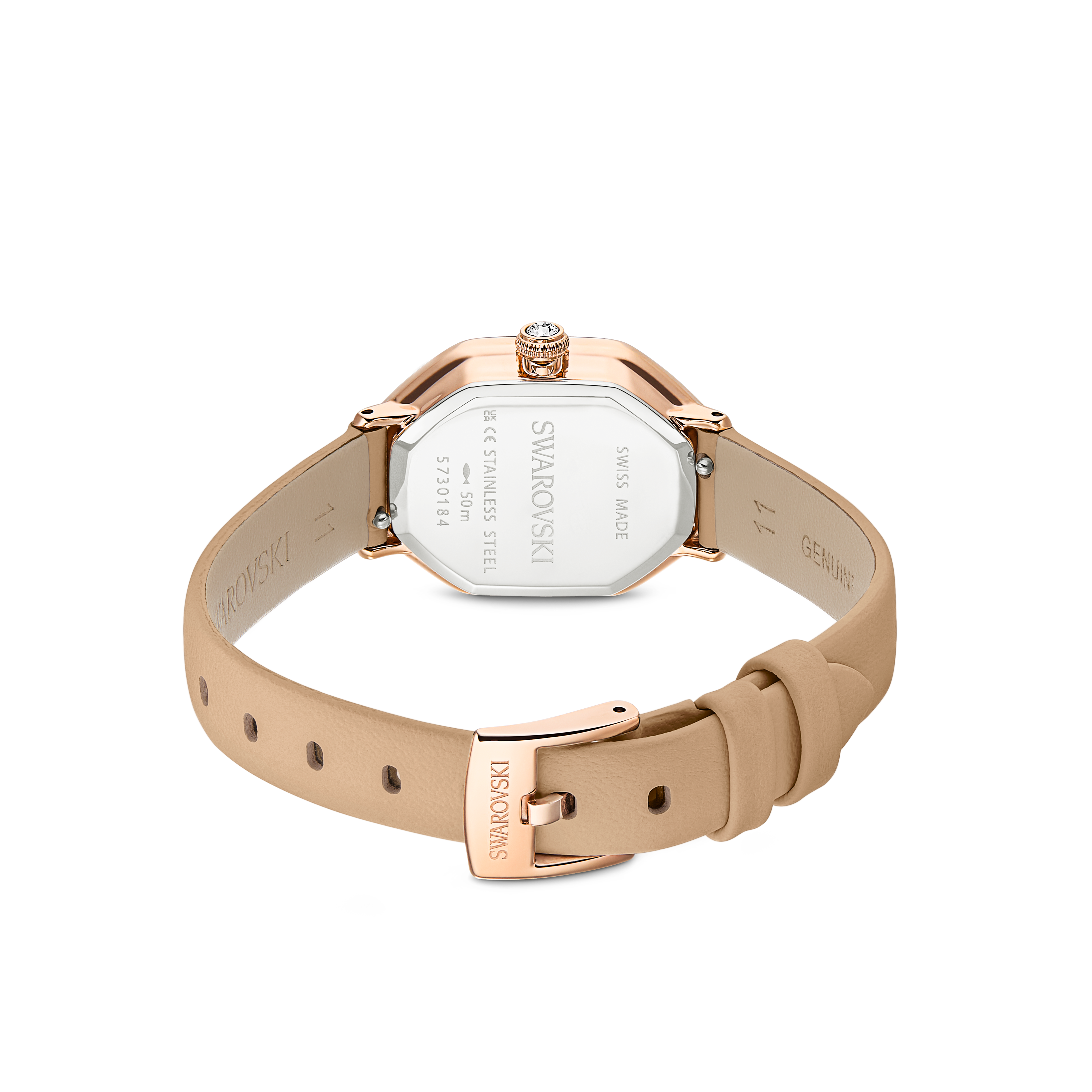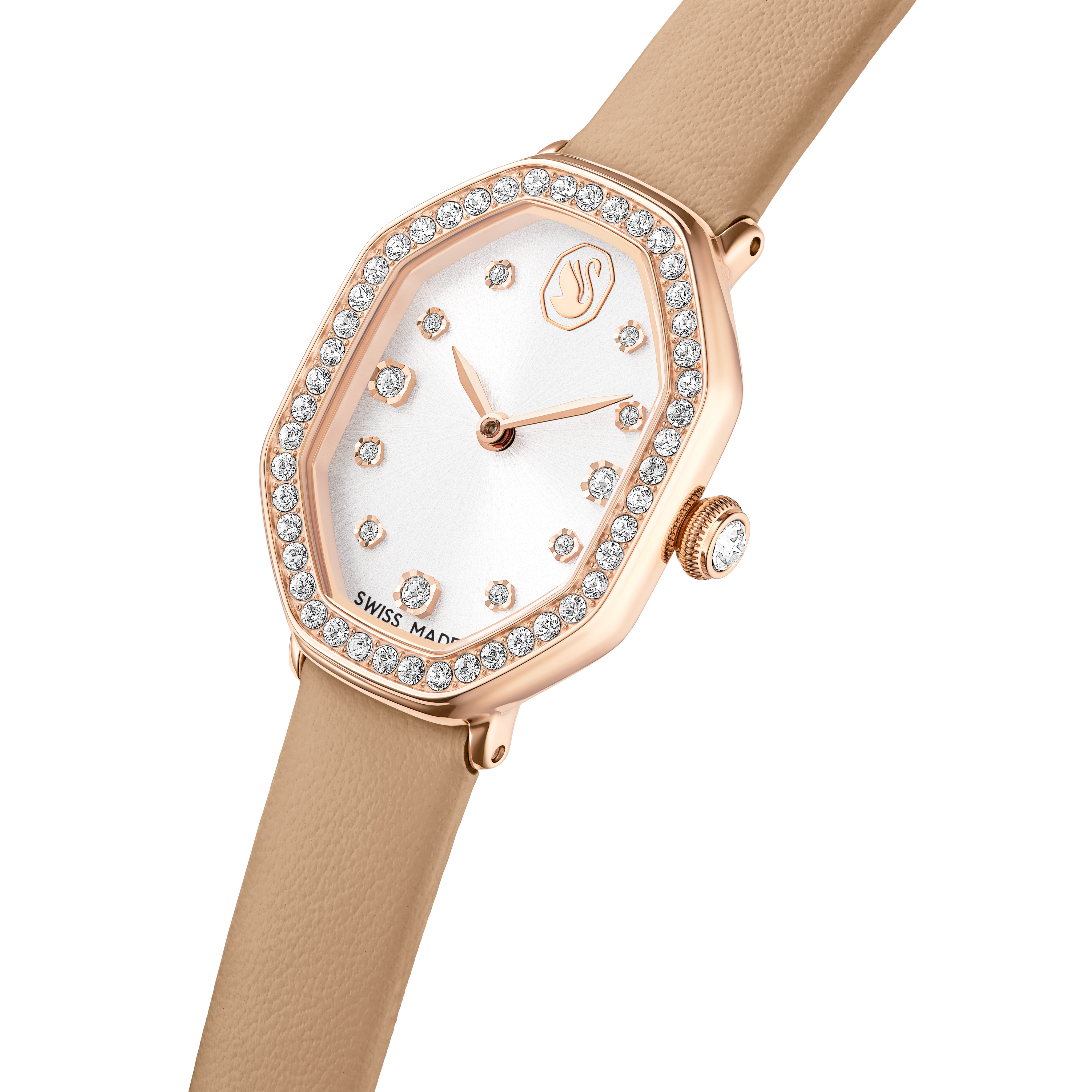 Вдохновленные вневременной элегантностью семейства Dextera, эти часы размером 18 x 23 мм выполнены в уникальной восьмиугольной форме, характерной для Swarovski. Изготовленные из нержавеющей стали с отделкой под розовое золото, они имеют безель, инкрустированный 46 кристаллами, и еще один кристалл, расположенный внутри заводной головки. Циферблат с эффектом солнечных лучей также включает в себя изящные кристаллические индексы, тонкие стрелки и логотип в виде лебедя на отметке 12 часов. Завершает это сияющее творение коричневый кожаный ремешок. Эти швейцарские часы водонепроницаемы до 50 метров.