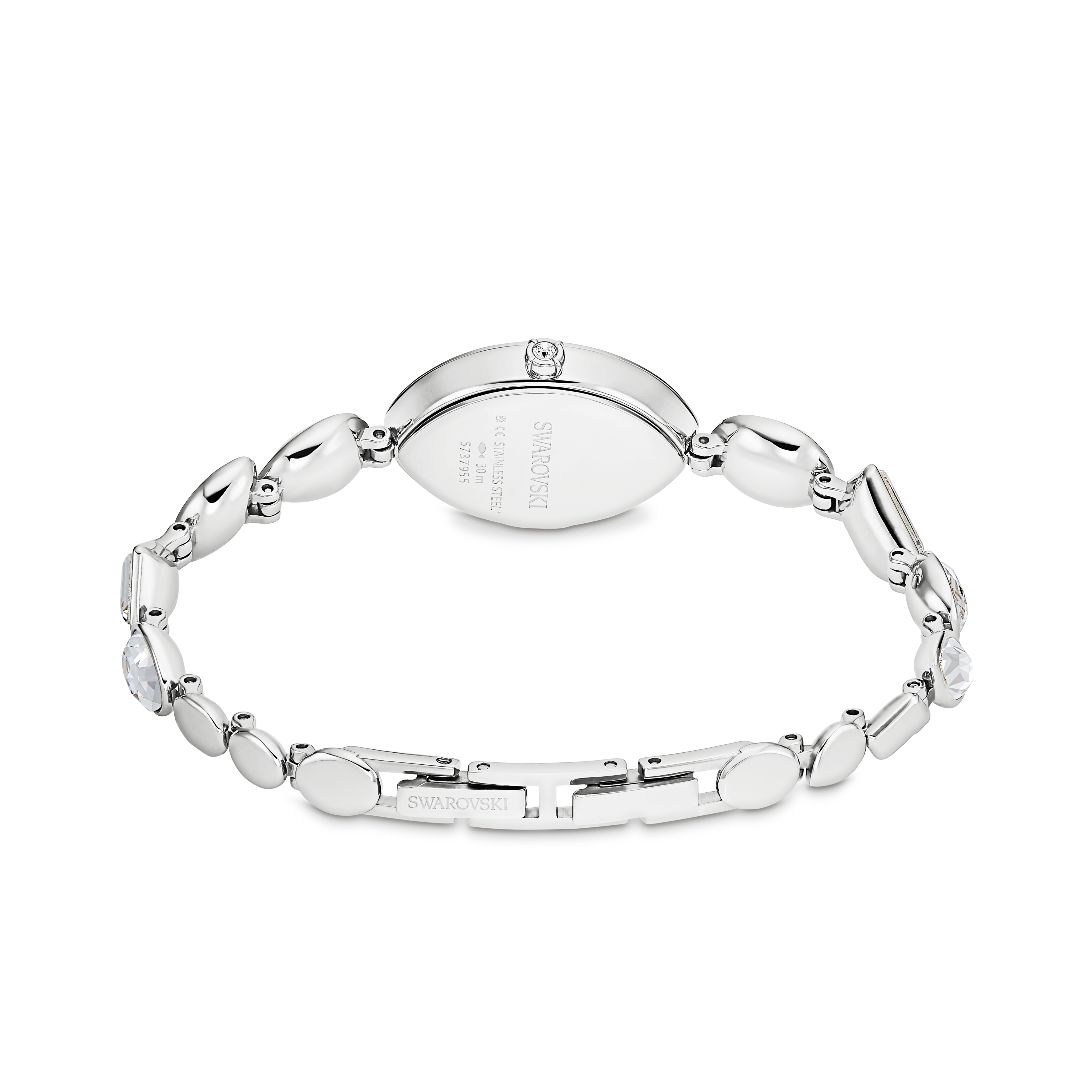 Эти часы Swarovski, вдохновленные ювелирным семейством Gema, отличаются захватывающим сочетанием форм. Корпус миндалевидной формы выполнен из нержавеющей стали, циферблат украшен гильошированным узором, тремя кристаллическими индексами и элегантным изображением лебедя. На запястье часы дополнены регулируемым браслетом, украшенным восемью кристаллами различной огранки. Водонепроницаемость до 50 м – это игривый способ добавить сияющей геометрии в ваш стиль.
