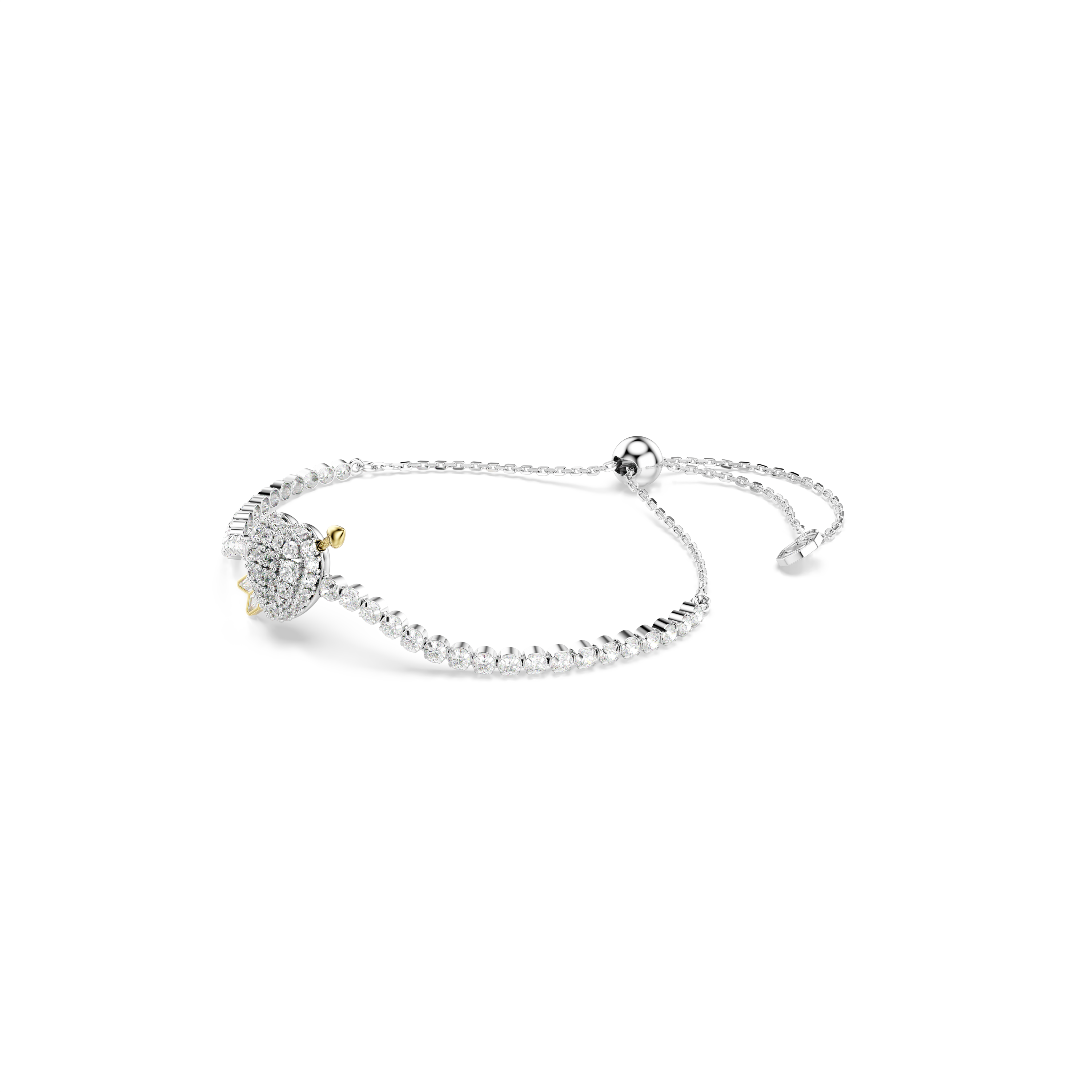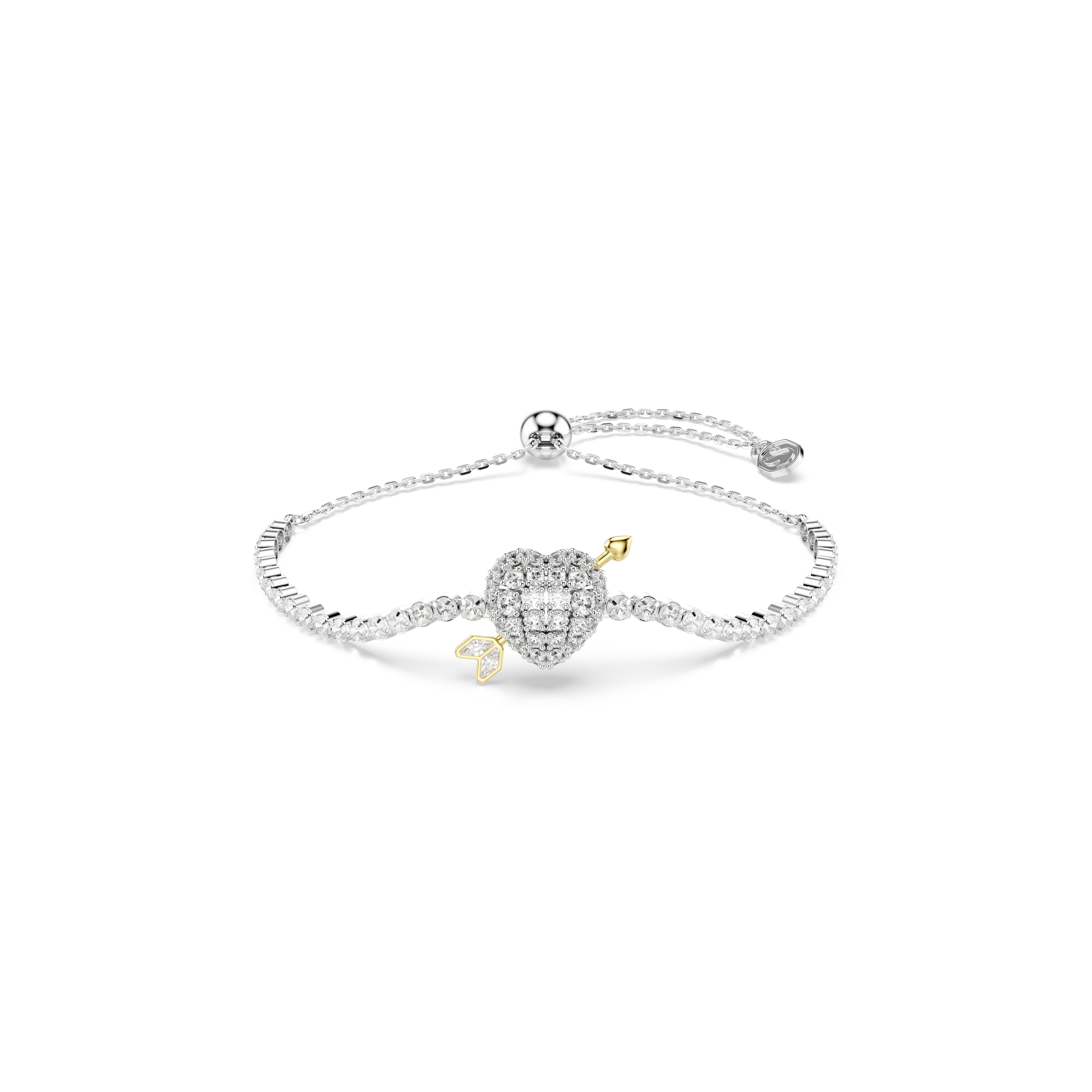 Истинная любовь встречается с сияющим светом в этом браслете Swarovski из коллекции Idyllia. Мягкая цепочка украшена кристаллами круглой огранки в родированной оправе, а в центре сверкающий мотив сердца пронзен золотистой стрелой Купидона. Регулируйте размер с помощью скользящей застежки и сочетайте браслет с другими украшениями из той же романтической коллекции.