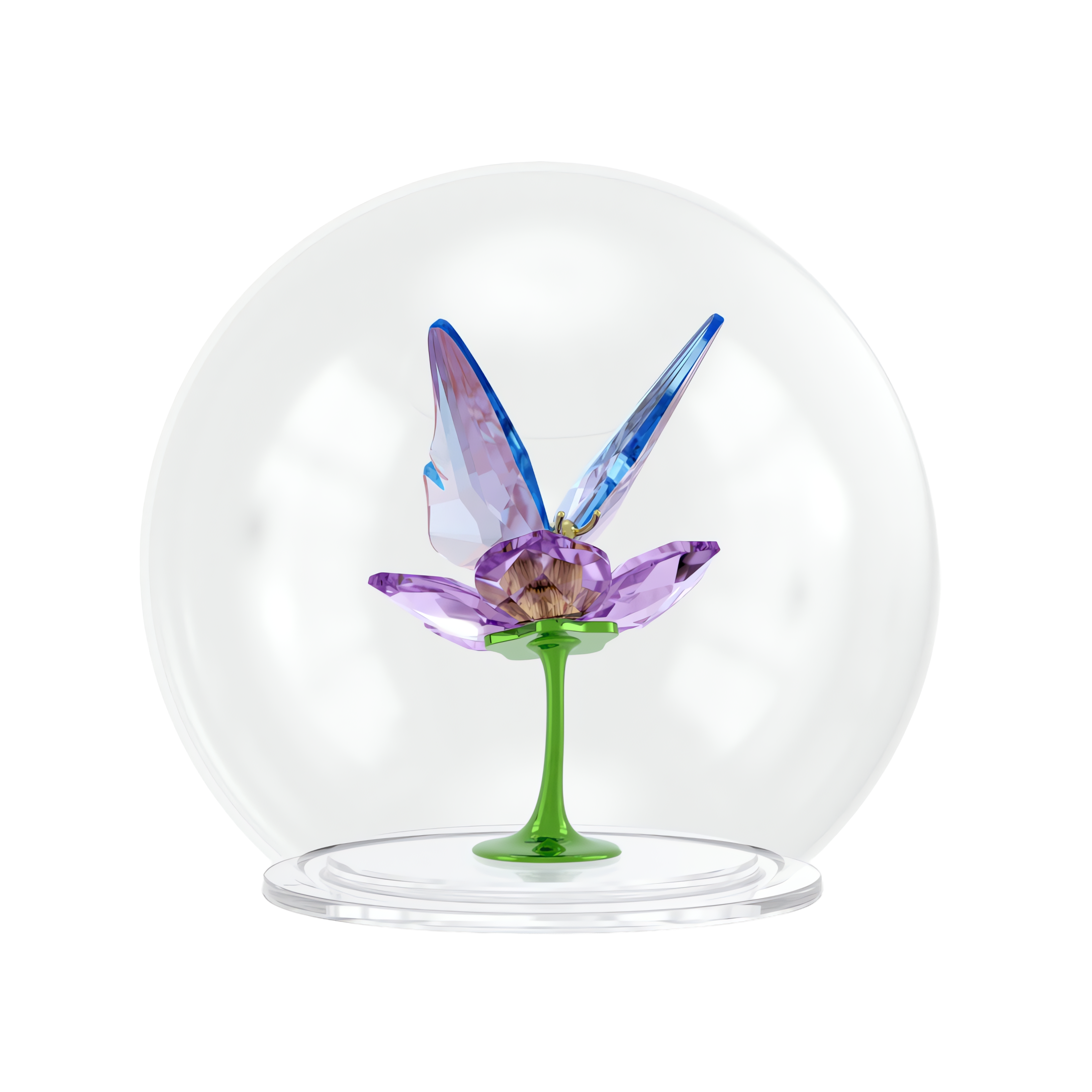 Компания Swarovski запечатлела эту бабочку в полете, придав легкость и движение этому спокойному стеклянному шару. Изделие, выполненное из 165 граней, включает в себя ярко-синие крылья с эффектом мерцания, ярко-фиолетовый цветок и глянцевые металлические акценты, которые гармонично сочетаются, создавая очаровательное украшение как для начинающих коллекционеров, так и для мечтателей. Декоративный предмет. Не игрушка. Не подходит для детей младше 15 лет.