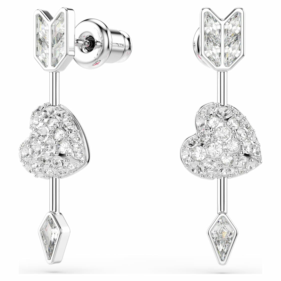 В этих выразительных серьгах Idyllia Купидон бьет дважды. Каждое изделие с родиевым покрытием украшено сердцем, пронзенным стрелой, с одной стороны — сверкающими прозрачными кристаллами, а с другой — ярко-розовым цветом. Носите их поперек, создавая разнообразные варианты украшений.
