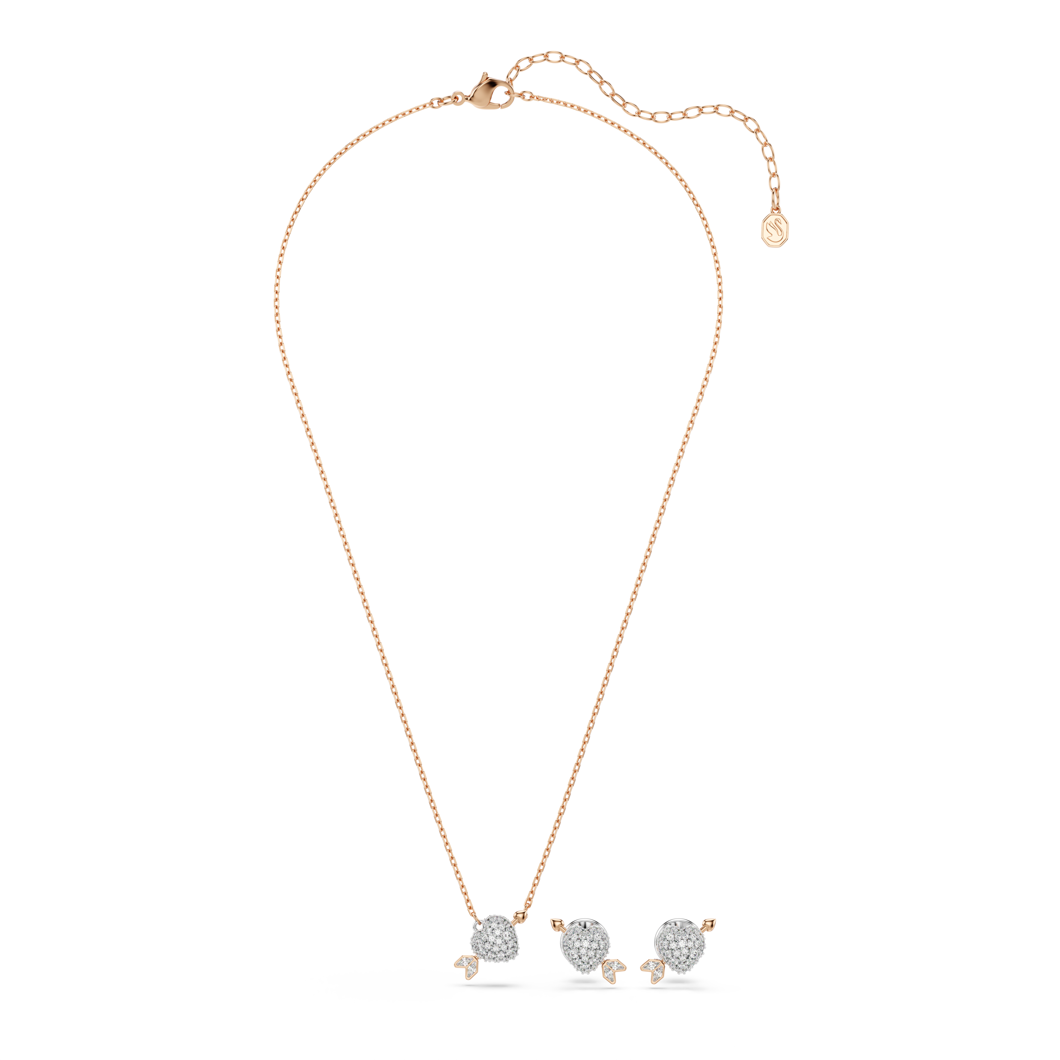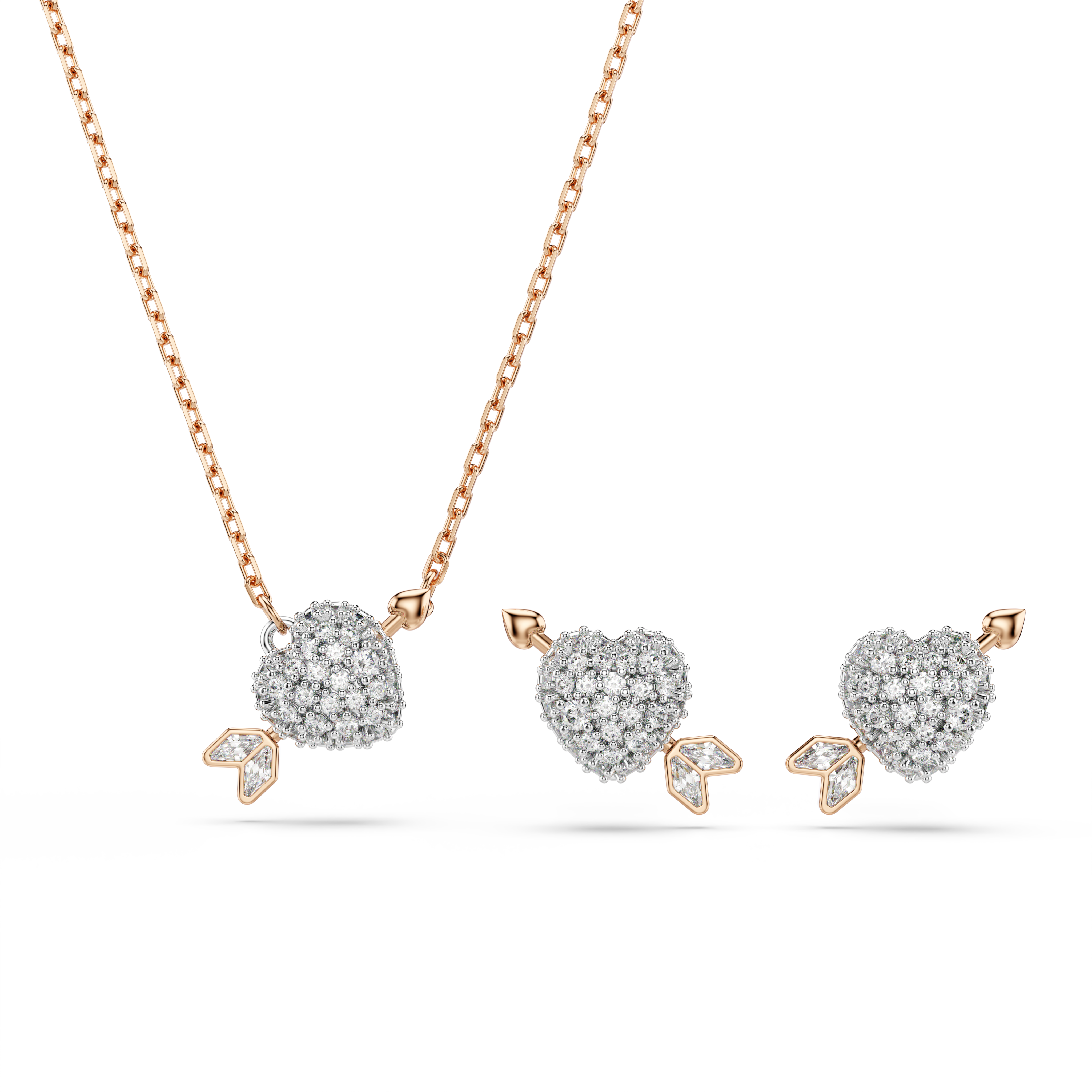 Добавьте страсти в свой стиль с этим сверкающим комплектом из кулона и сережек. Каждое родированное сердечко украшено прозрачными кристаллами и пронзено стрелой Купидона цвета розового золота. Уникальное сочетание для тех дней, когда любовь заслуживает сияния.