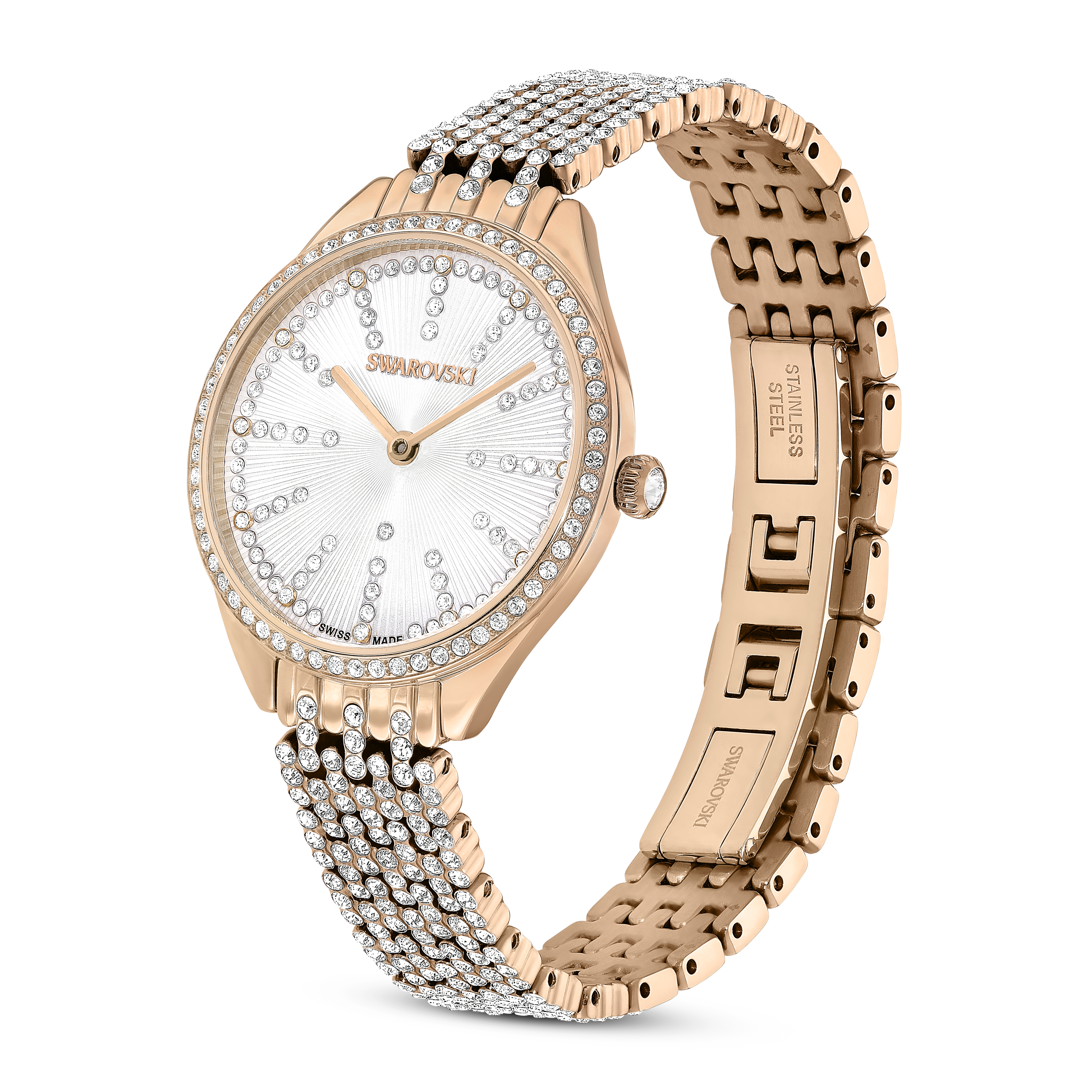 Для создания изысканного образа эти современные 30-миллиметровые часы выполнены с отделкой под розовое золото и украшены 433 кристаллами. Элегантный серебристый циферблат дополнен гильошированным узором и кристаллами в качестве индексов, а тонкий безель и браслет инкрустированы собственными паве из сверкающих прозрачных кристаллов. Водонепроницаемость до 50 м, эти превосходные швейцарские часы с одним камнем в заводной головке идеально подходят для роскошного образа как днем, так и вечером.