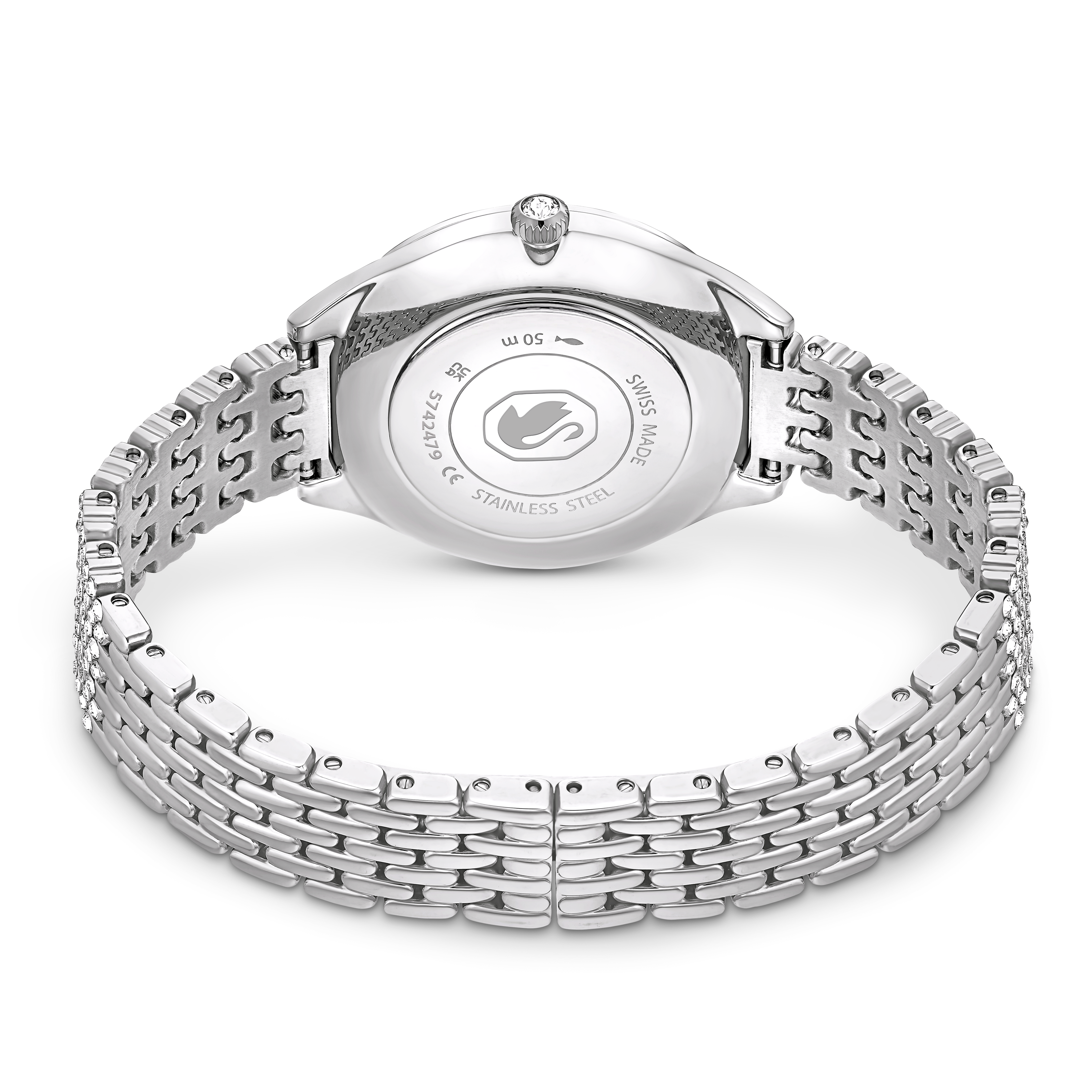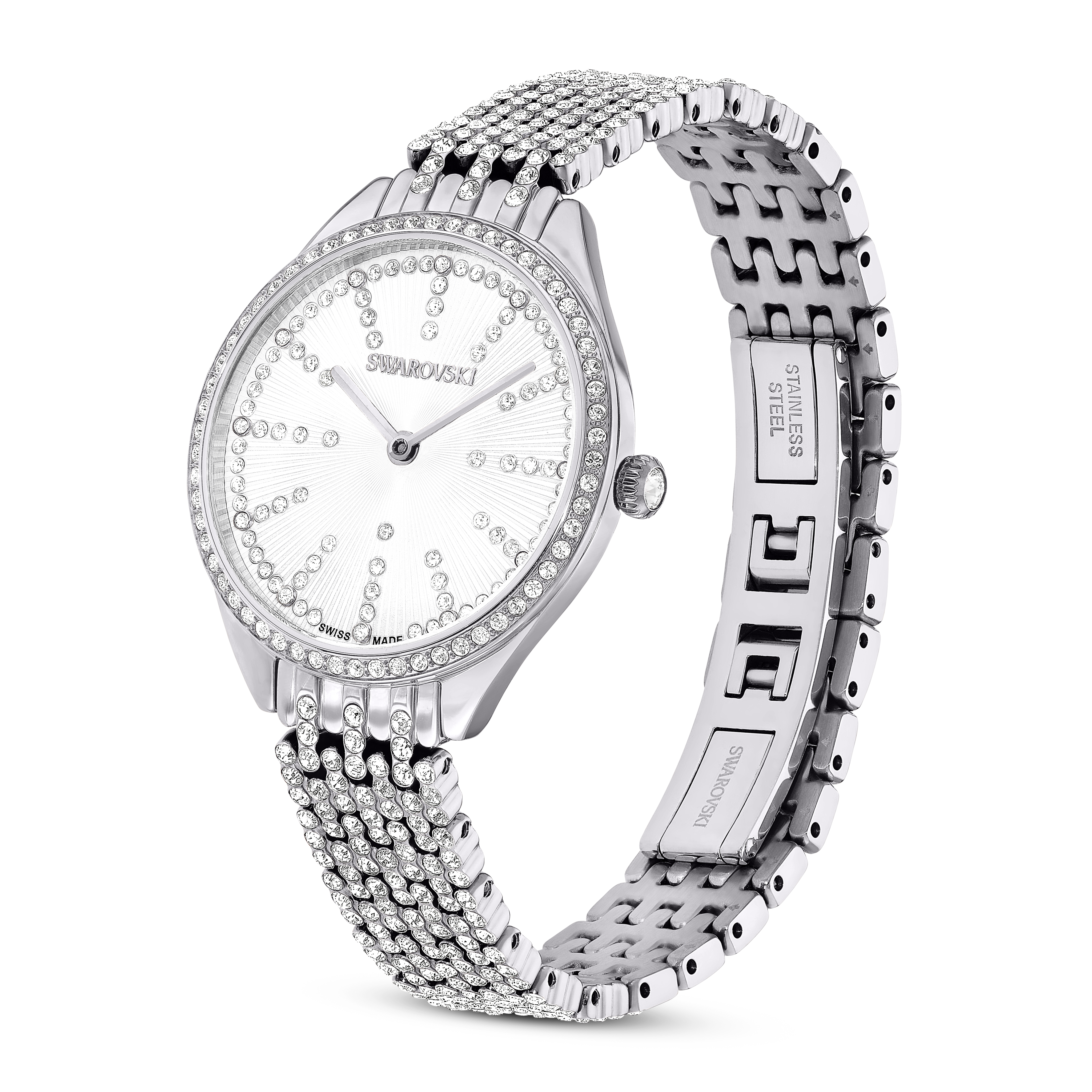 Простота нержавеющей стали в этих швейцарских часах великолепно подчеркнута благодаря эффектному использованию 433 кристаллов. На серебристом циферблате с гильошированным узором вы найдете кристаллы в качестве индексных меток, а тонкий безель и браслет украшены собственными паве из сверкающих прозрачных кристаллов. Часы диаметром 30 мм водонепроницаемы до 50 м и имеют один камень в заводной головке. Общий вид призван произвести тонкое, но заметное впечатление, дополняя любой ваш образ.