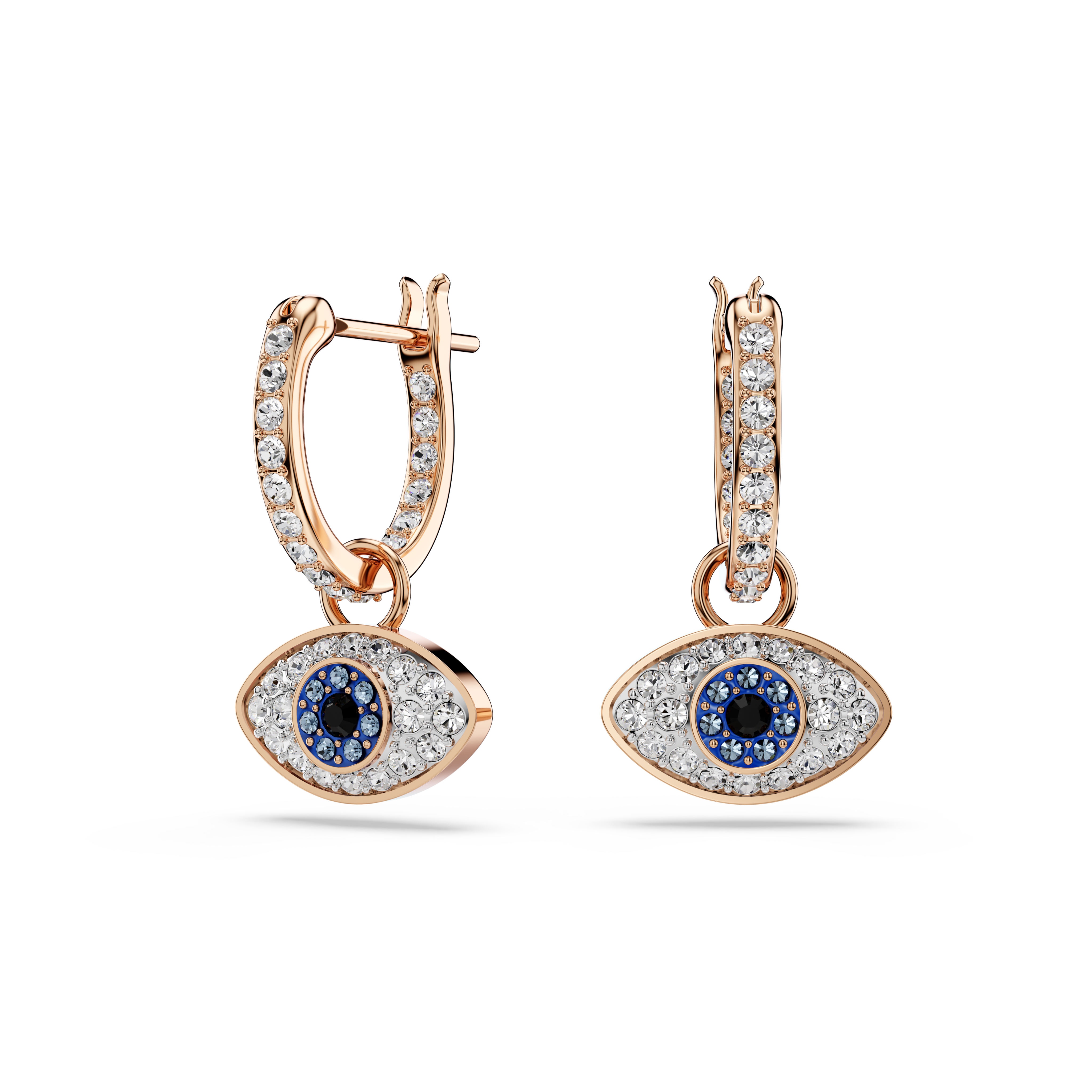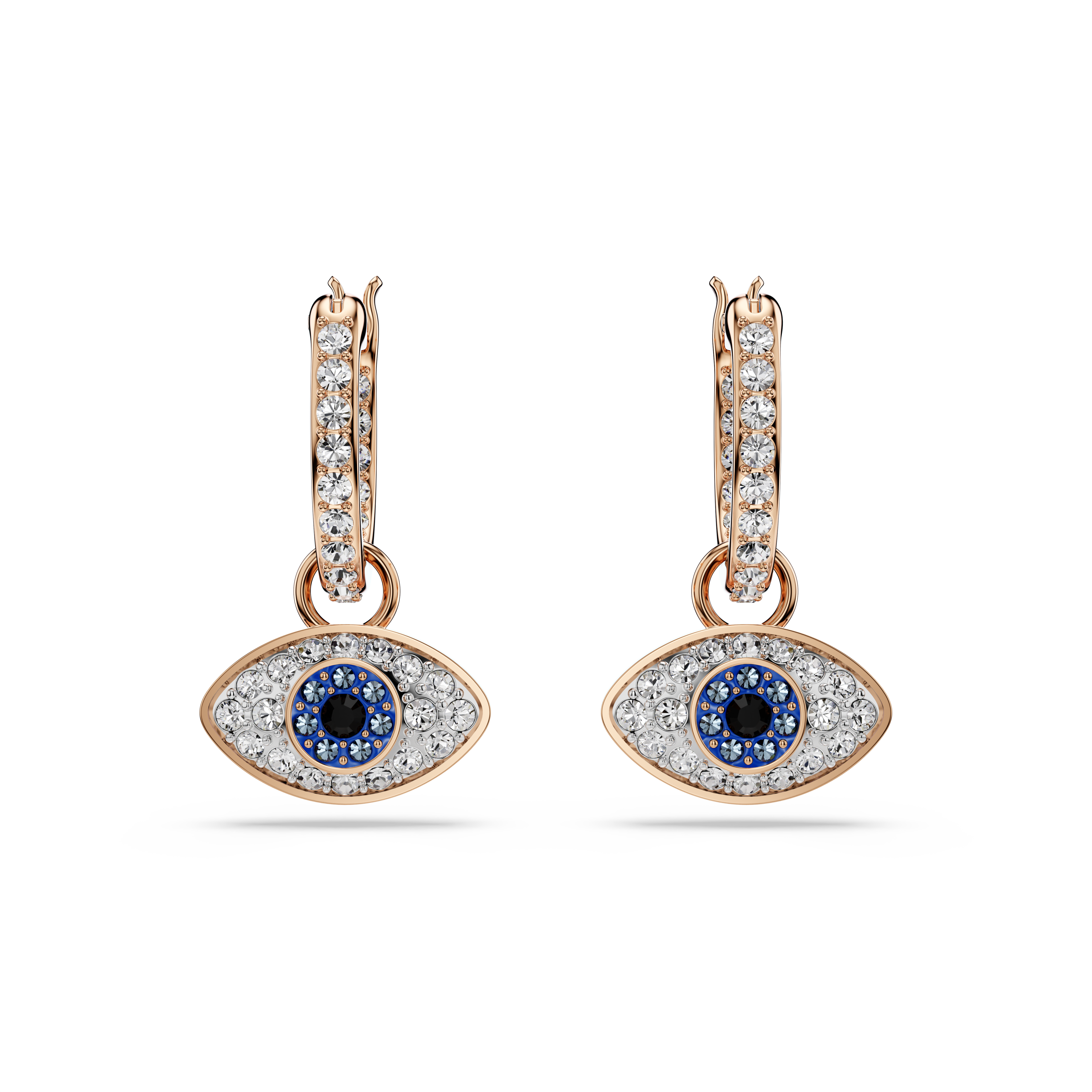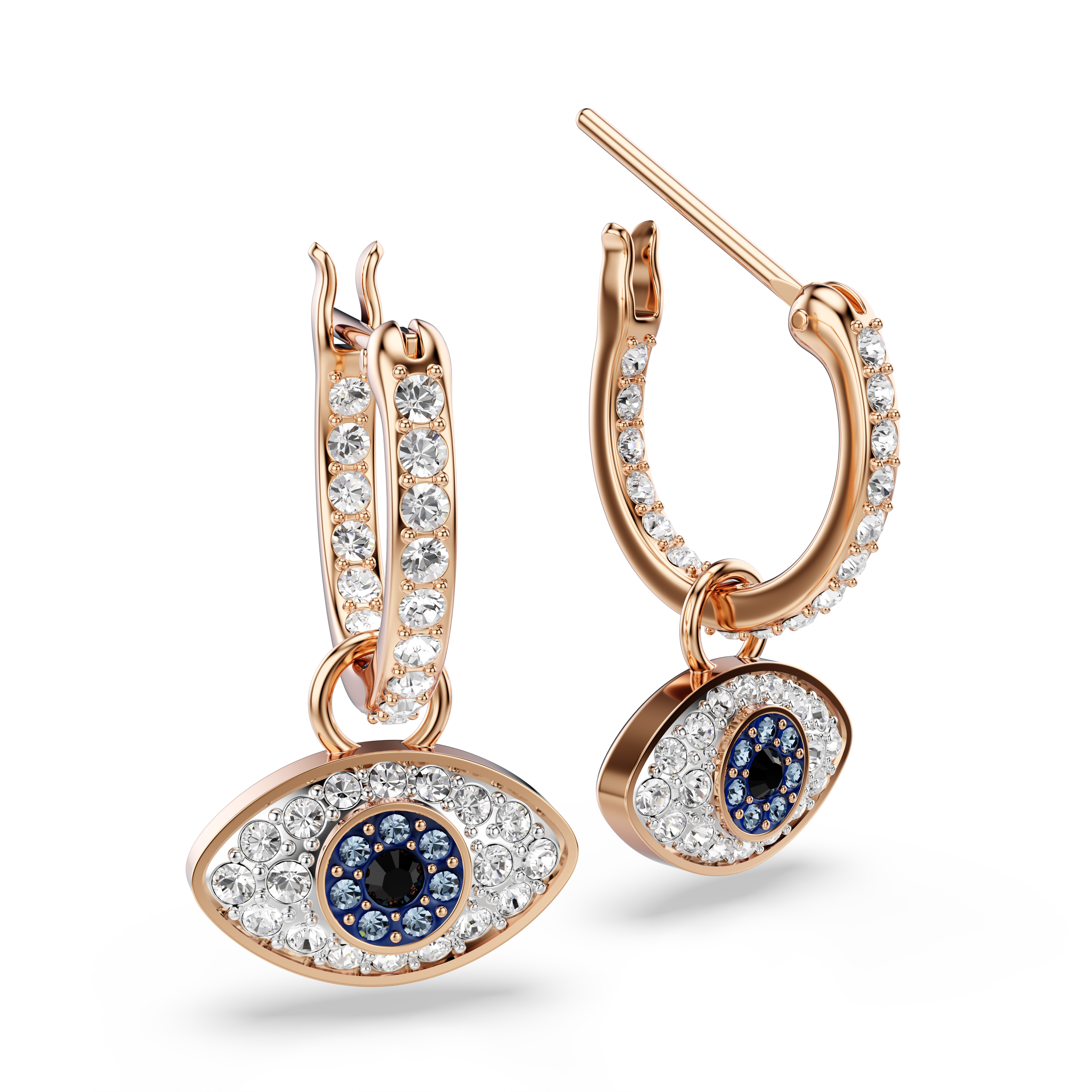 Раскройте свою духовную сторону с помощью этих сережек с покрытием из розового золота. Подвешенные на классических кольцах с паве, выпуклые мотивы «злого глаза» украшены прозрачным, синим и черным паве. Эти серьги, обыгрывающие традиционный символ талисмана, добавят любому наряду нотку мистического очарования.